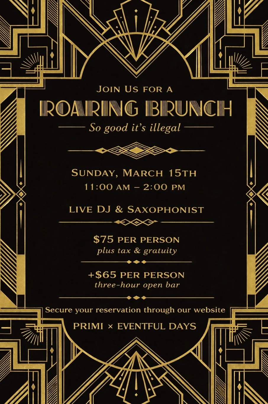 Our Themed Brunch is $75 per guest with the option of a three hour open bar package for an additional $65 per guest, plus the customary NYS sales tax and a 20% service gratuity.
